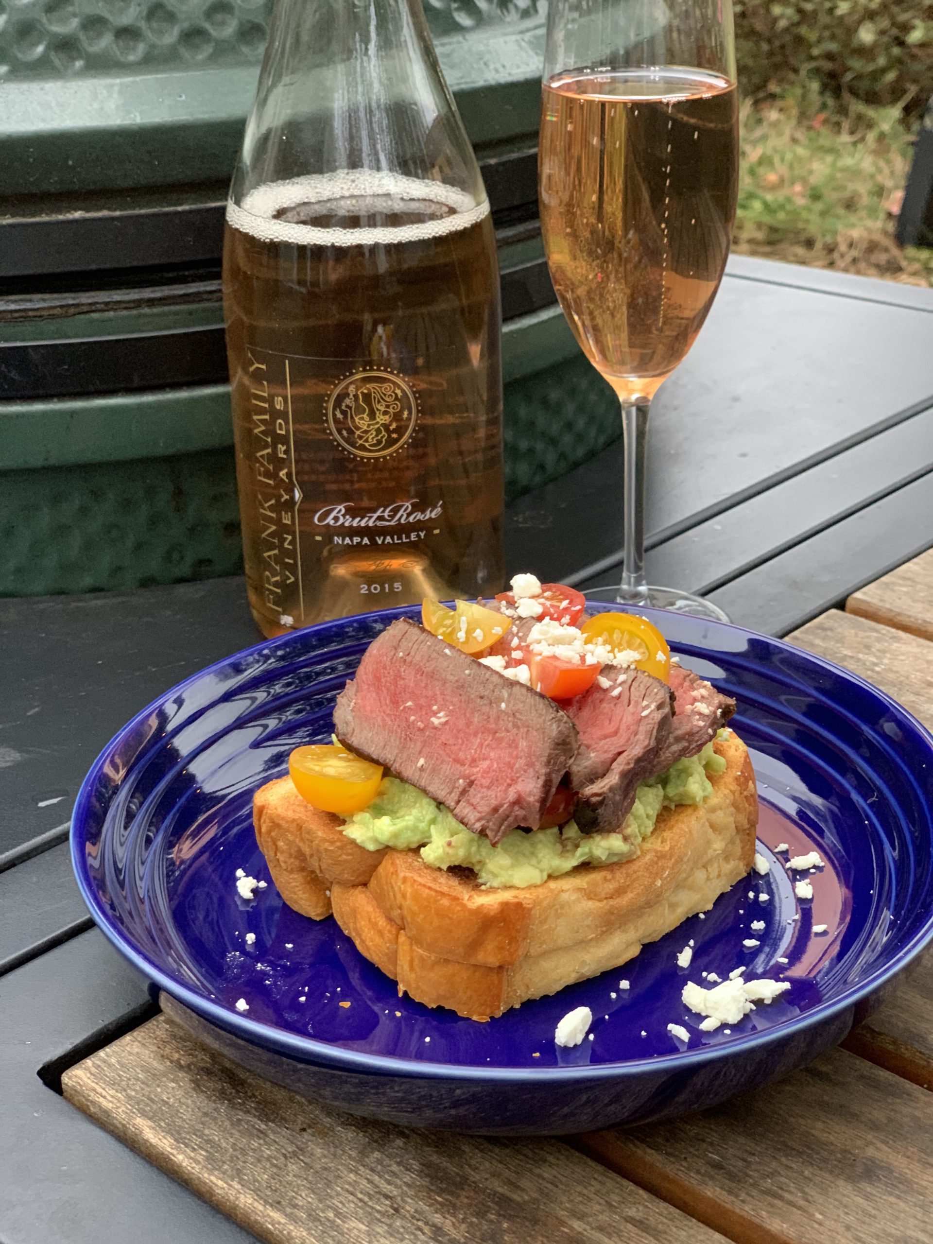1. Grill the filet to medium rare and let rest 2. Toast two slices of brioche, stack on top of each other 3. Spread heavy coat of mashed avocado on toasted brioche 4. Top with slices of steak, sliced cherry tomato and feta cheese
